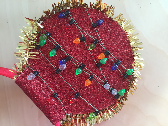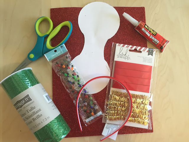 1. Gather your supplies: glitter foam, a headband, glue, scissors, tulle (or a ready made bow), trim, and decor (I used Christmas lights). You will also need a template for the ears, which you can find here over at Inspired By Dis, and some cardboard (not pictured, I used an old Ritz box).