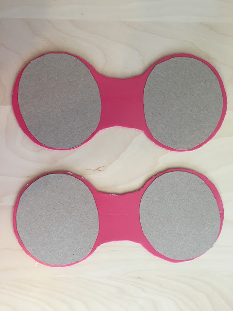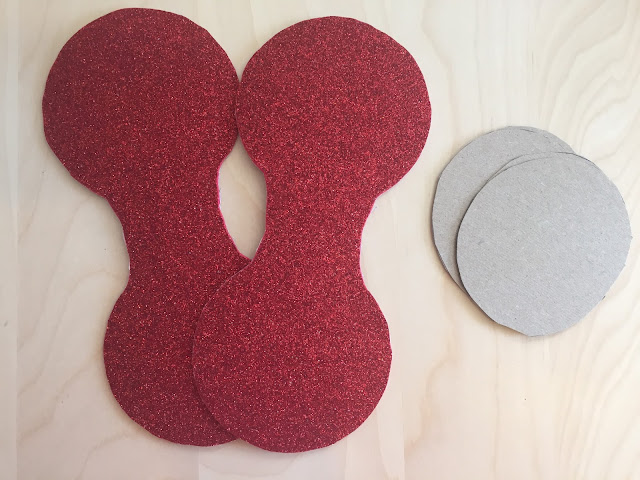2. Using the template, cut out two ear shapes from the glitter foam and four cardboard circles. This was the first time I used the cardboard in addition to the foam and it made a big difference. These ears are much sturdier and held up to the wind much better than any of my other pairs. I will always use cardboard from now on!