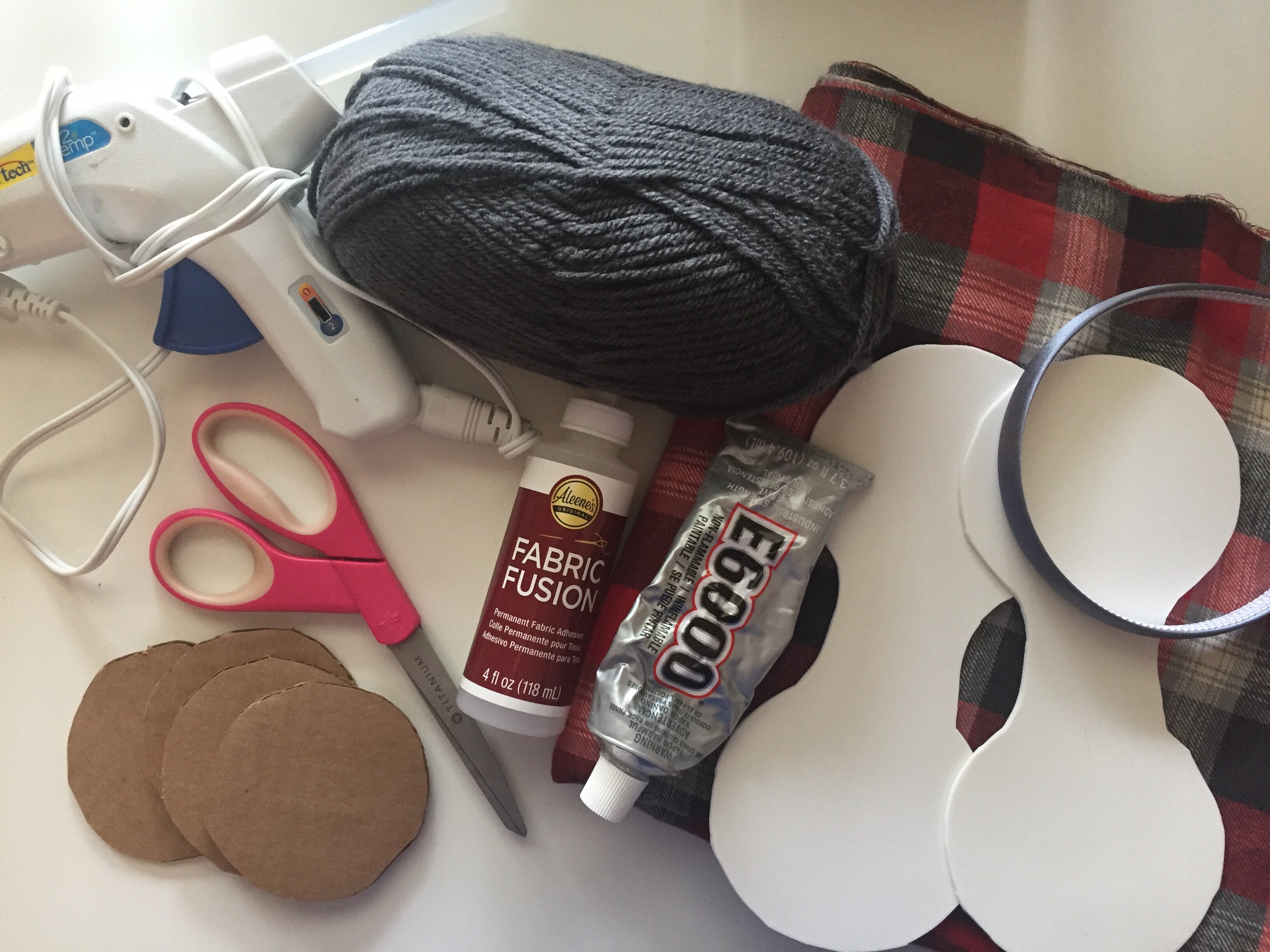 First, let’s gather our supplies: fabric of your choice, a headband, foam cut out in the ear shape (I use this template found here), a hot glue gun, E6000 glue, cardboard circles, good scissors, fabric glue, and yarn (yarn is specific to these particular ears, but whatever fabric you use, you will want some kind of trim).