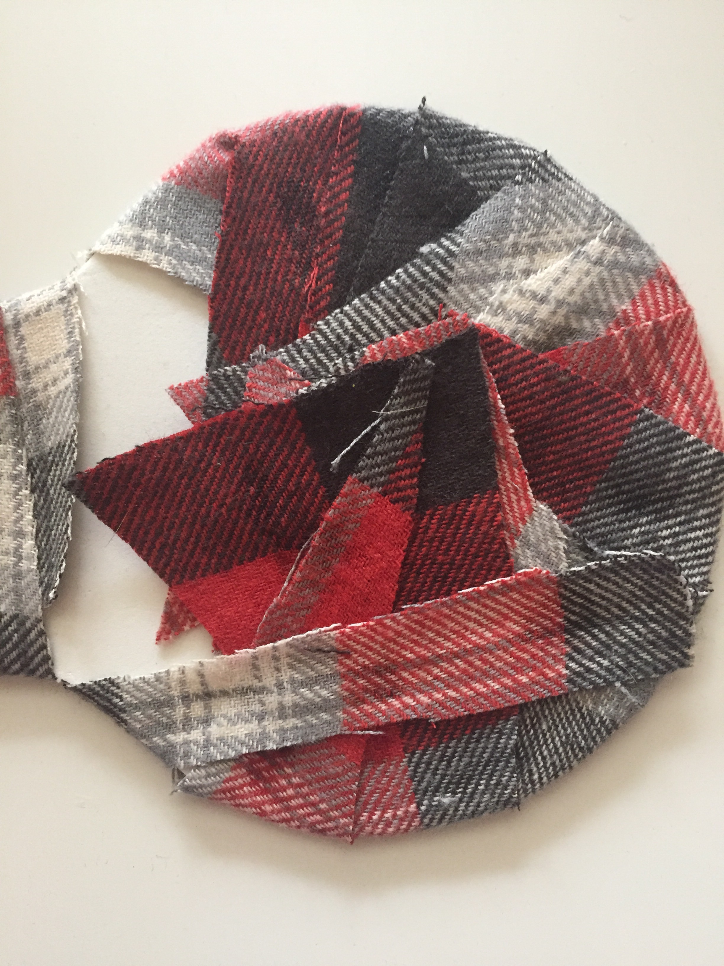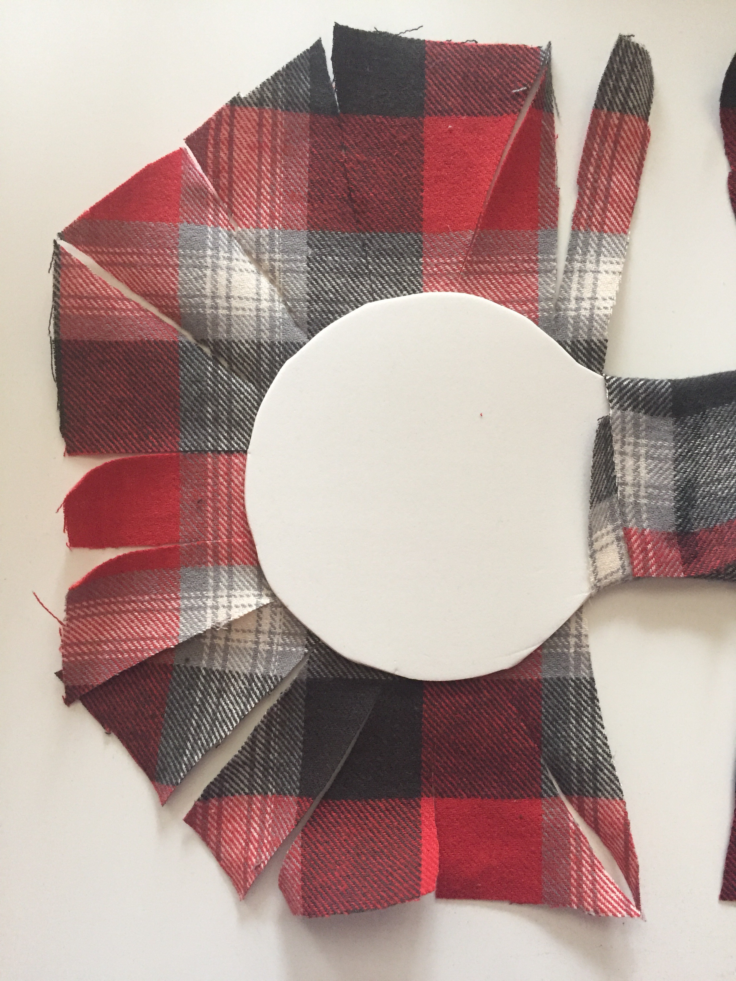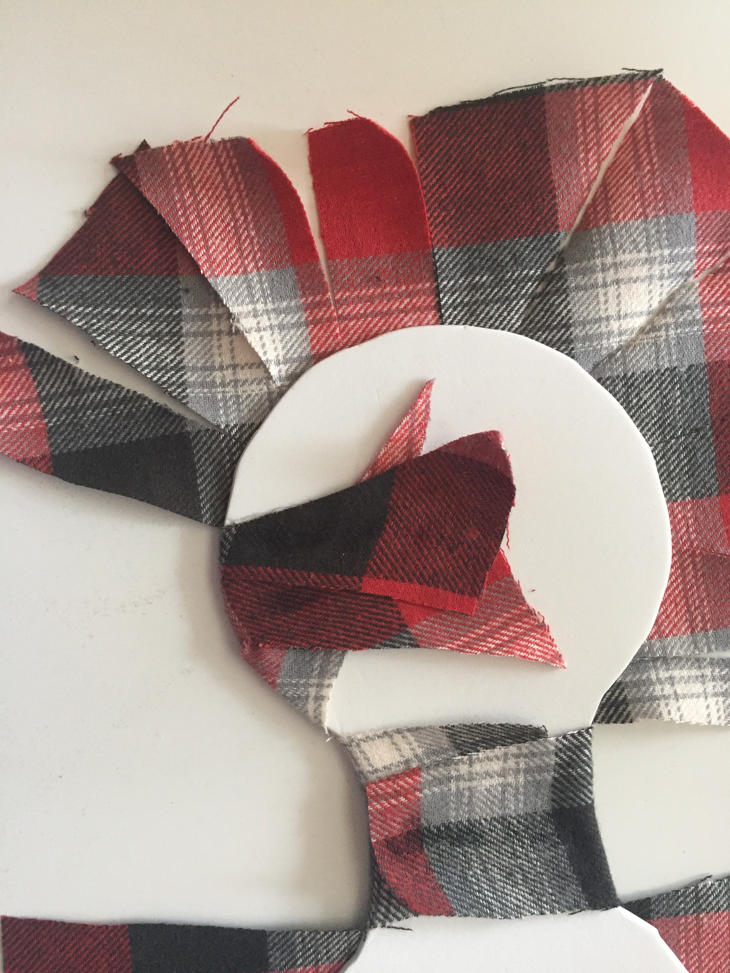 Then comes the tedious part. In order to glue the fabric around the round part of the ears, you need to cut the fabric into thin strips.