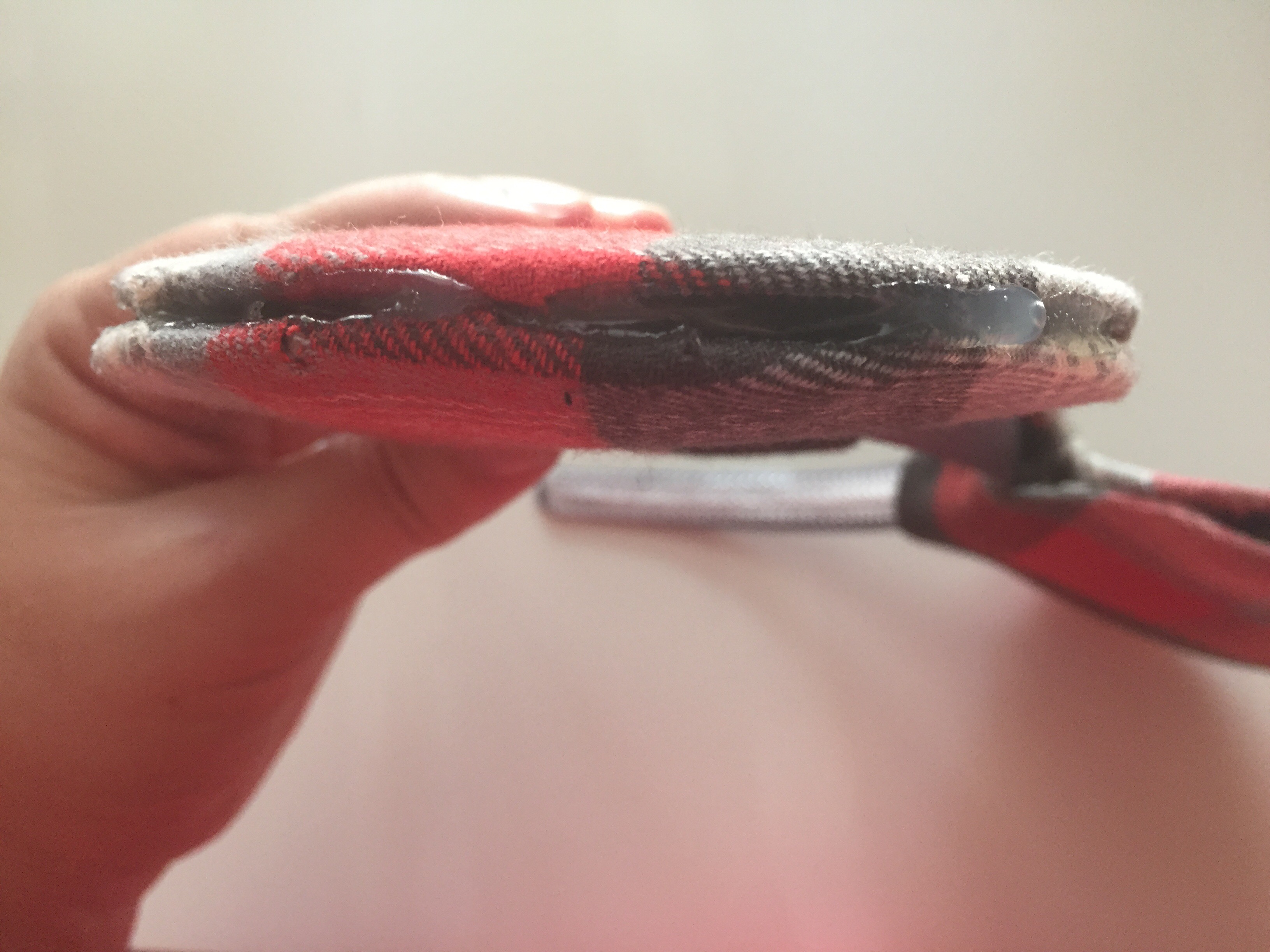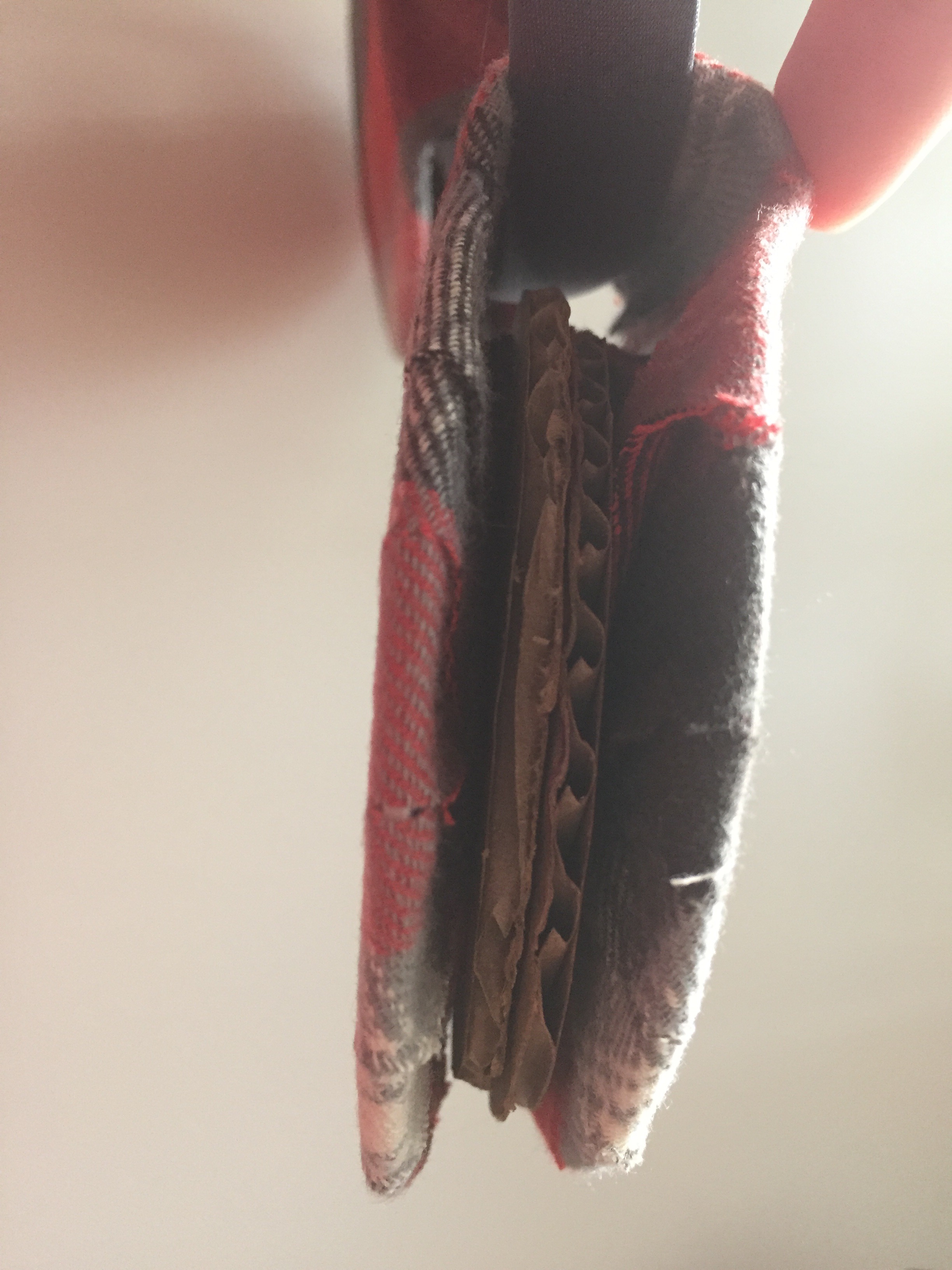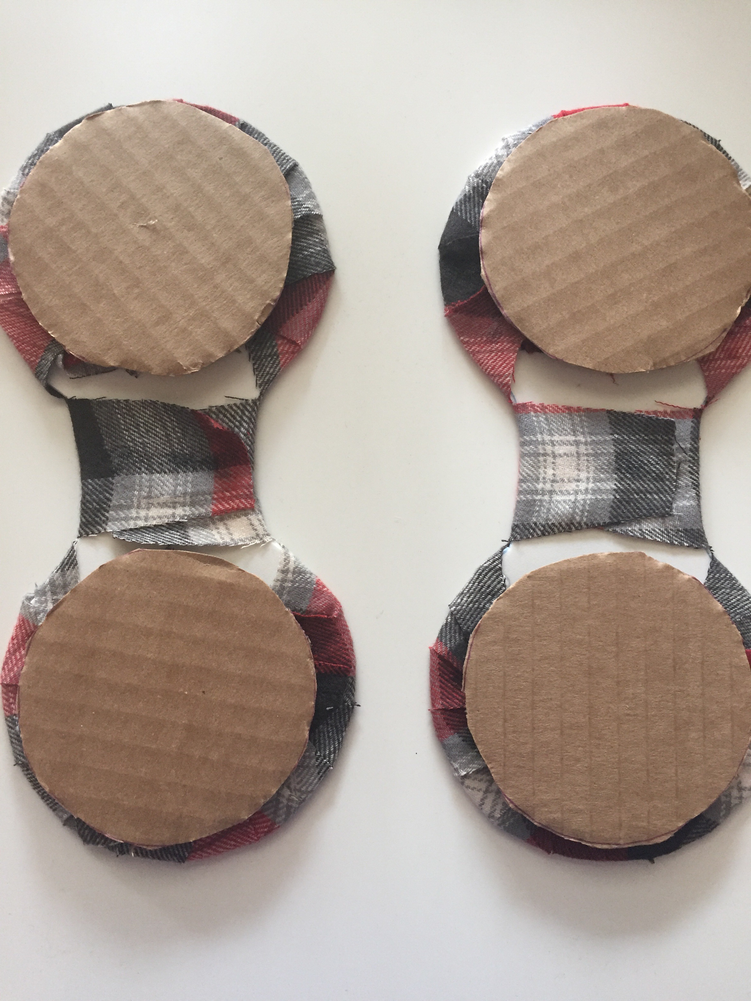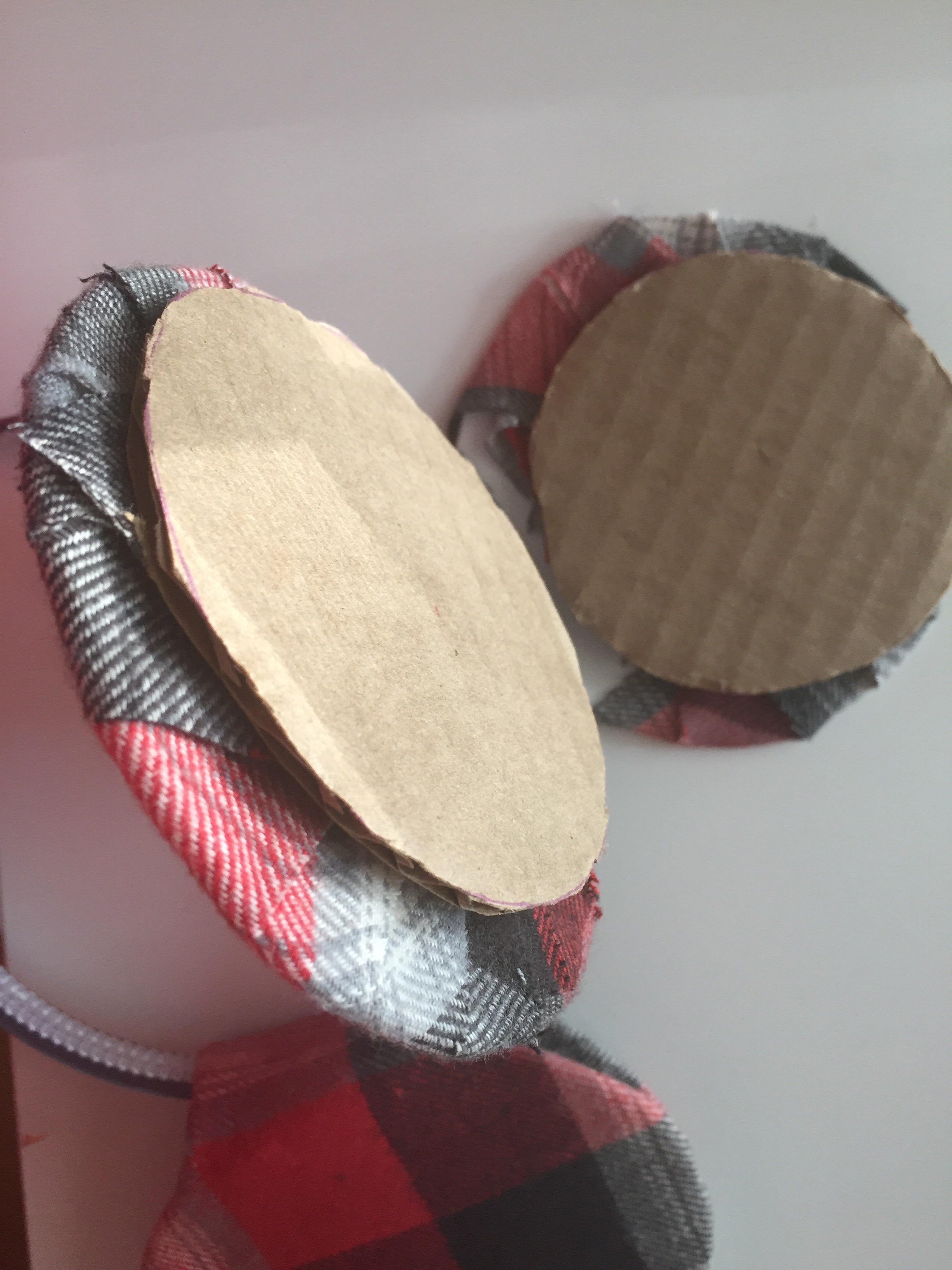 Then use the E6000 glue to attach one cardboard circle to each ear part. This does a couple of things. One, it gives the ears more weight so they are sturdier. Two, it helps really seal in all the fabric strips and make sure they stay put. Then (this is important) LET THE EARS DRY OVERNIGHT. Trust me, the remaining steps will be much simpler if your ears are completely dry.