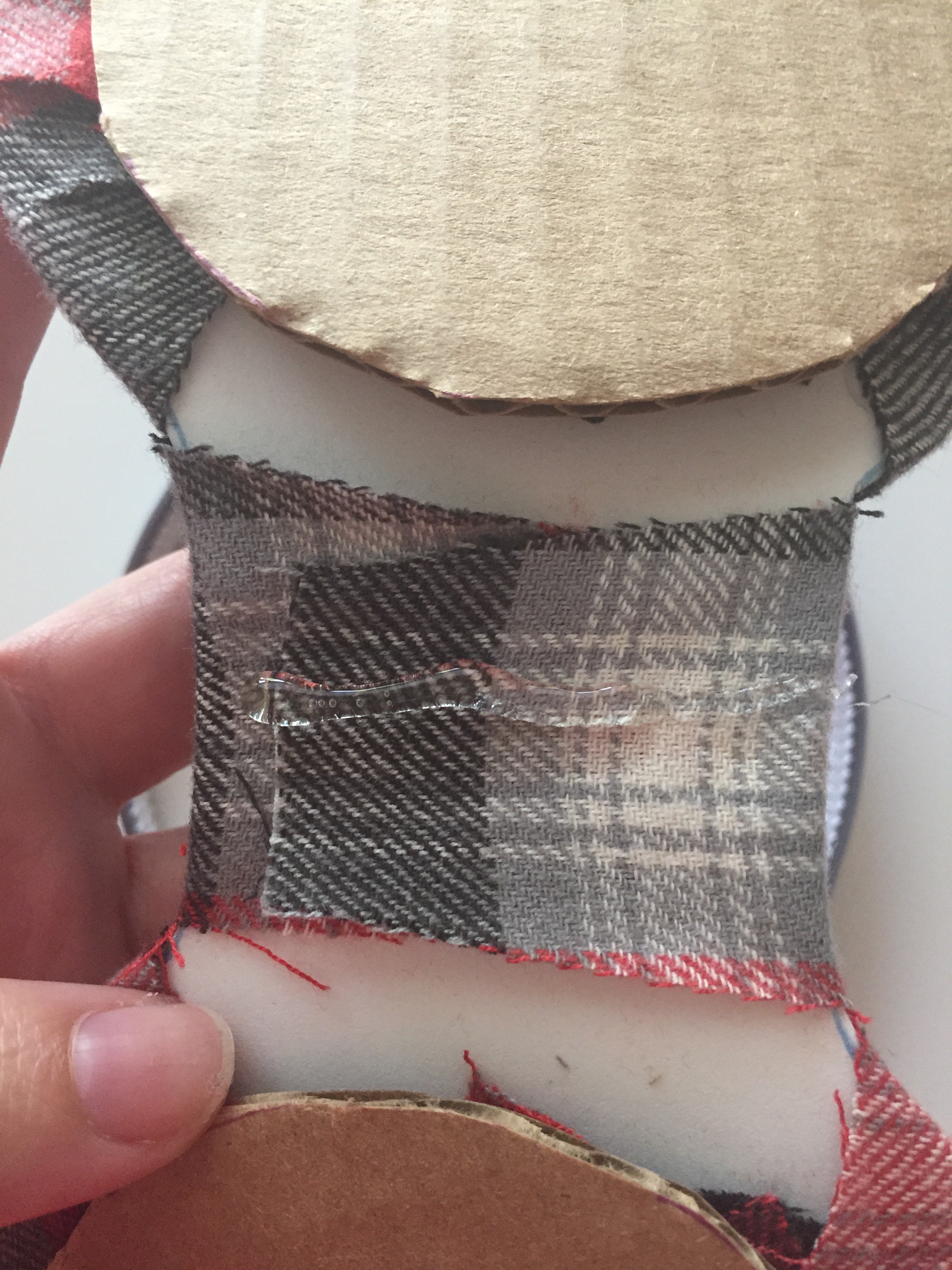 Now we are going to begin covering the ear template with the fabric. Start with the middle section. Cut in toward the center of the ear template and glue the strip of fabric to the foam using the fabric glue.