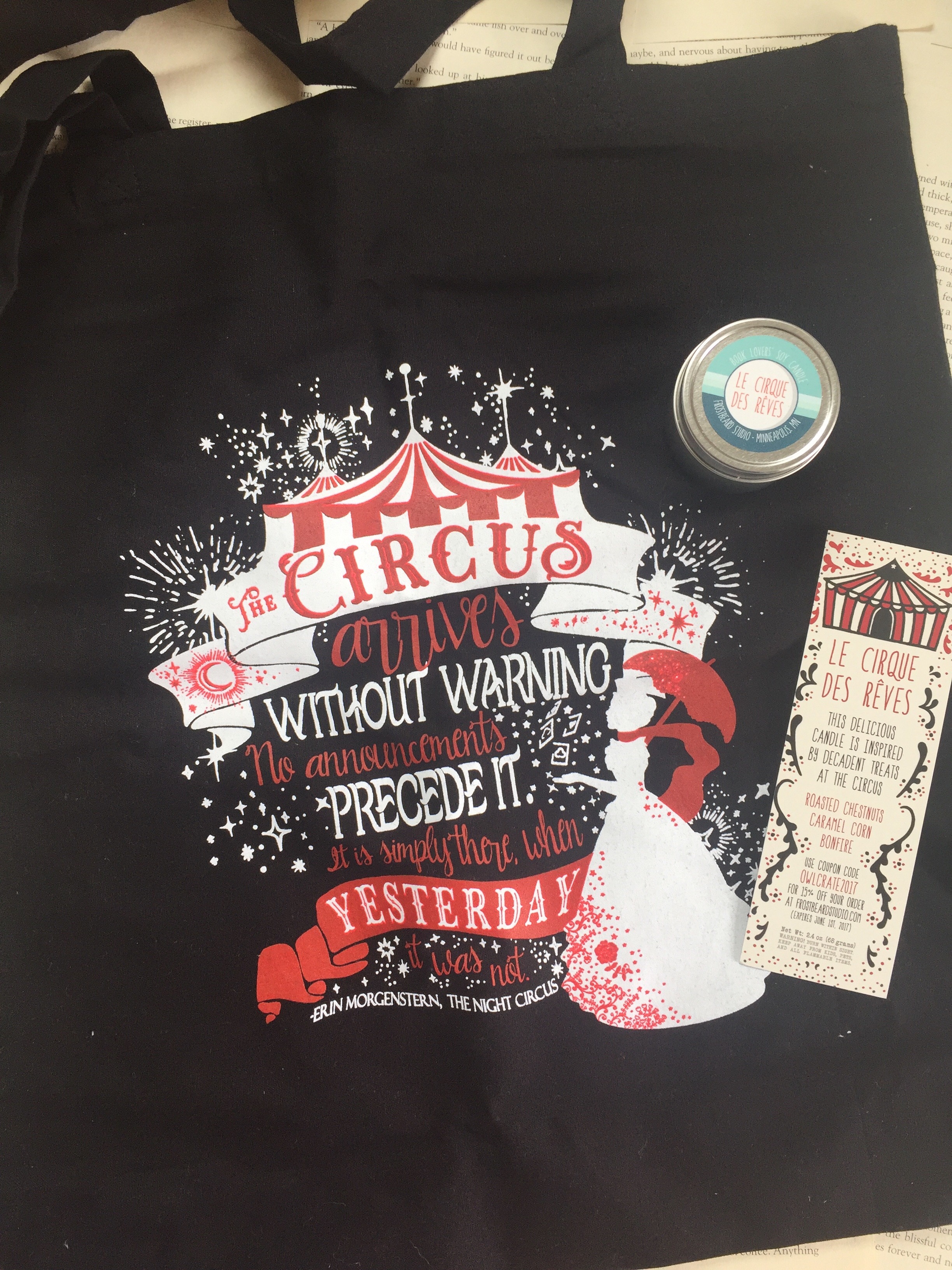 My favorite item this month is this Night Circus inspired tote bag from Evie Bookish. I am a tote bag whore, and I especially love literature bags, so this one is my new fave. And this Le Cirque des Reves inspired candle from Frostbeard Studio smells divine.