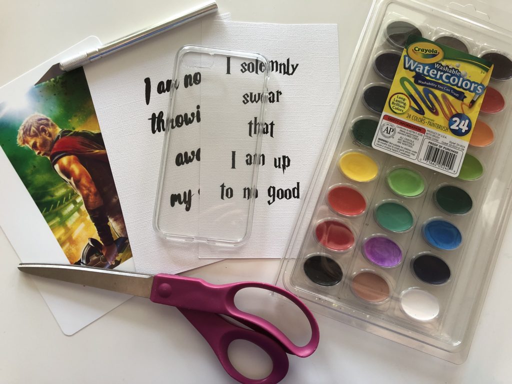 I decided to go with two different types of case, one a photo and one a watercolor quote. You will need your printed photo and quotes (approximately 3 inches by 5.5 inches if you have an iPhone 8), a clear phone case, watercolor paints, an X-acto knife, and scissors.
