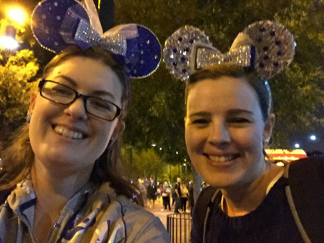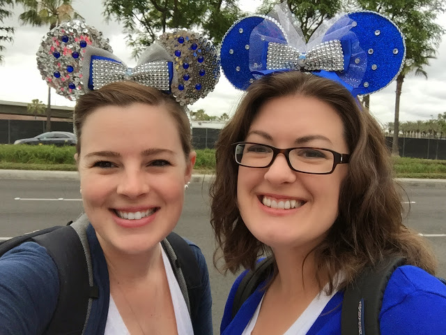 Here we are waiting for our ART shuttle, I’m wearing my blue DIY Minnie ears. Brianna doctored up her silver ears she already had with some blue rhinestones and a new bow.