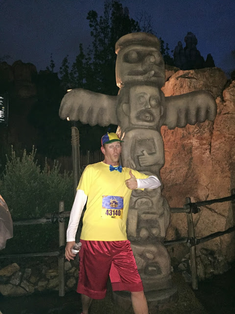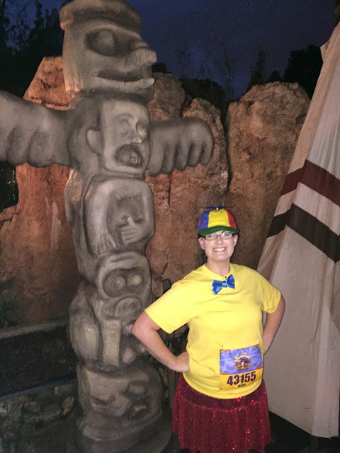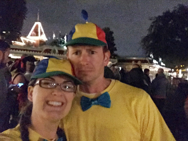 We arrived at the park bright (well, actually dark) and early at around 4:15 am. It was sprinkling a little as we waited outside the front gates to be let into the park. The nice thing about our Tweedle Dee and Tweedle Dum costumes is that the bill of the hat protected my glasses from the rain! As you can see, the hubs was super excited to be up so early and hanging out in the cold.
