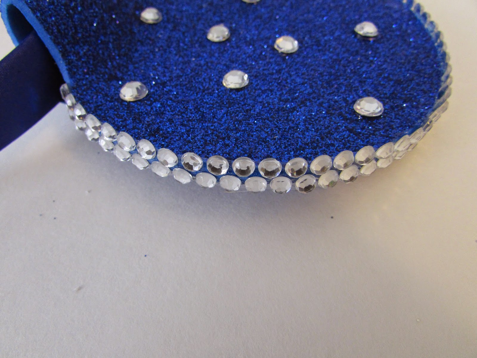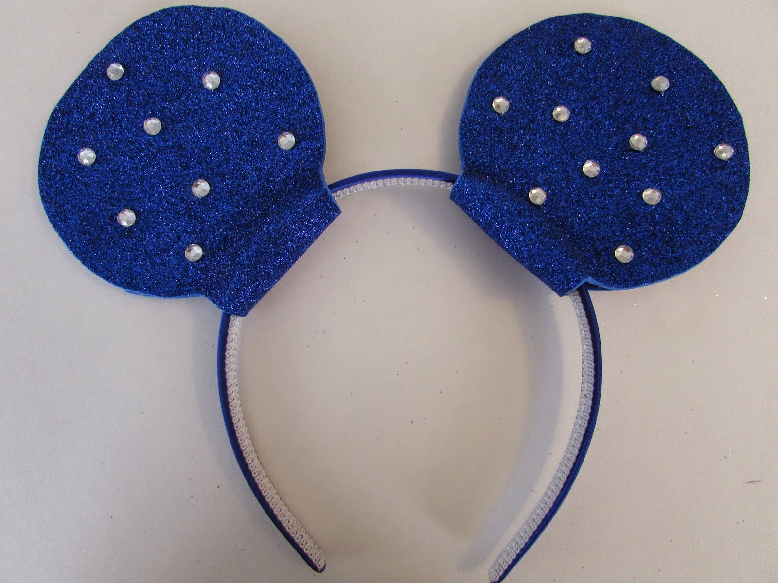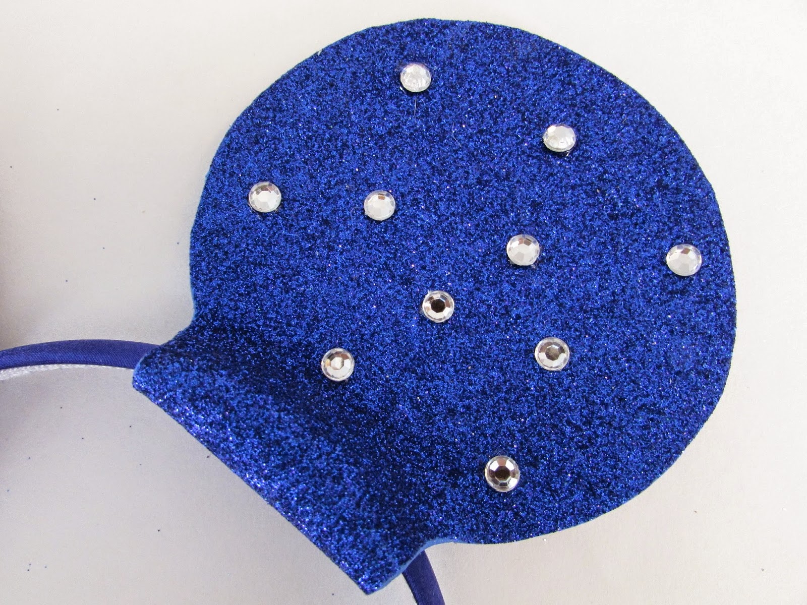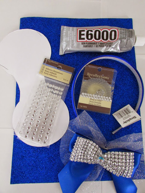 1. Gather supplies: blue adhesive glitter foam, ear template, single rhinestones, “bling on a roll”, E6000 glue, a blue headband, super blingy bow (again, this one was already in existence for me, but you could easily make your own). With the exception of the headband, which I found at JoAnn, all of my supplies are from Michael’s.
