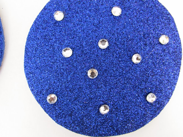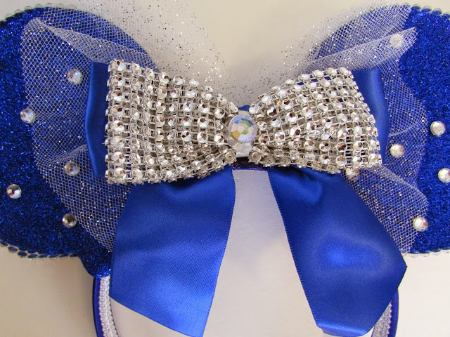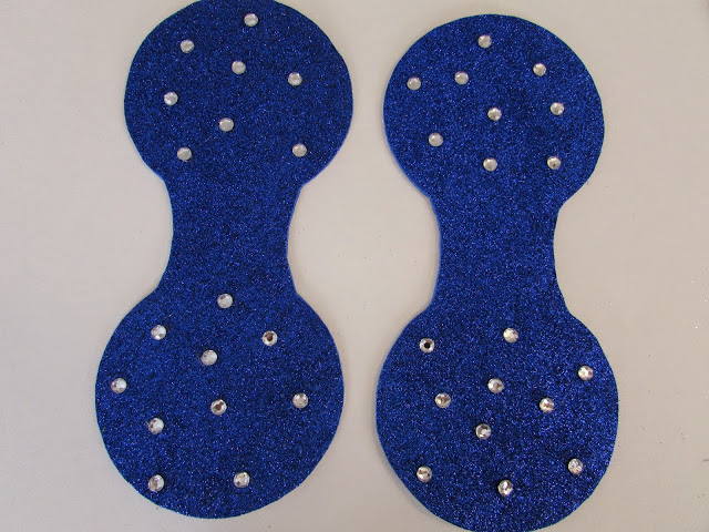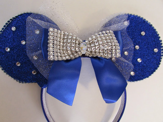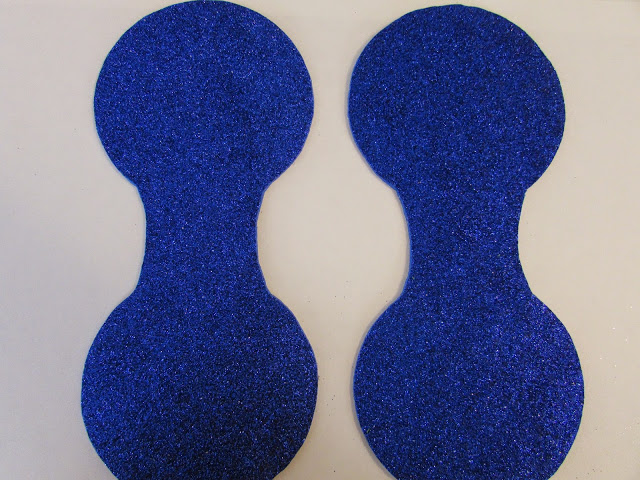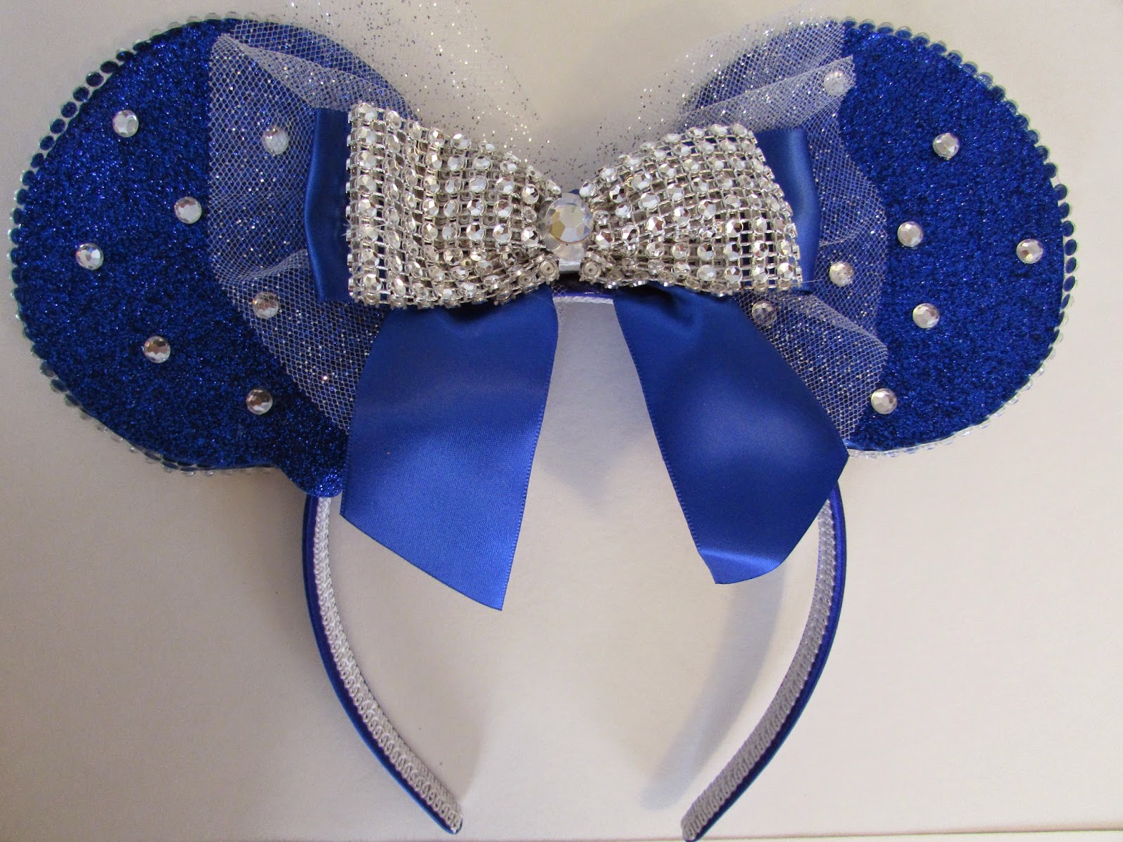 1. Gather supplies: blue adhesive glitter foam, ear template, single rhinestones, “bling on a roll”, E6000 glue, a blue headband, super blingy bow (again, this one was already in existence for me, but you could easily make your own). With the exception of the headband, which I found at JoAnn, all of my supplies are from Michael’s.