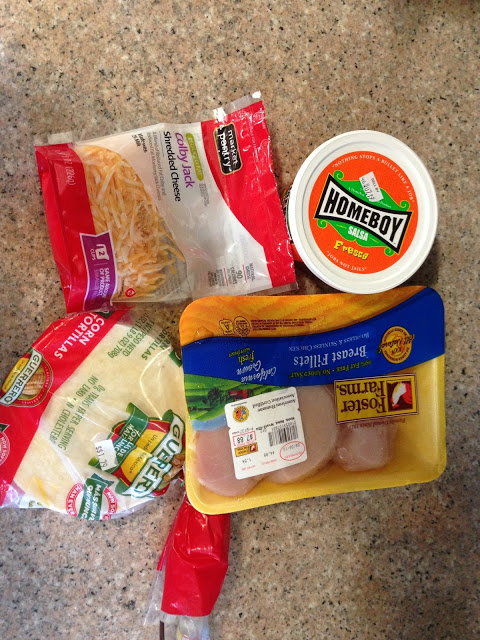 1. Gather ingredients. You need chicken breasts, salsa, and shredded cheese. Tortillas make a nice complement, but they are optional. That’s it!