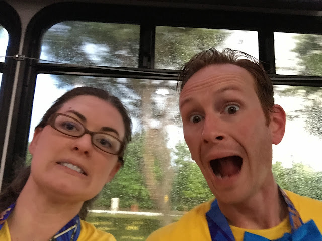 By the time we got to the finish line, the rain was coming down pretty good, so we got our medals and snack packs and hit the road. Looking back, I’m bummed we didn’t get a picture at the finish line, but we did get this gem on the shuttle back to the hotel…